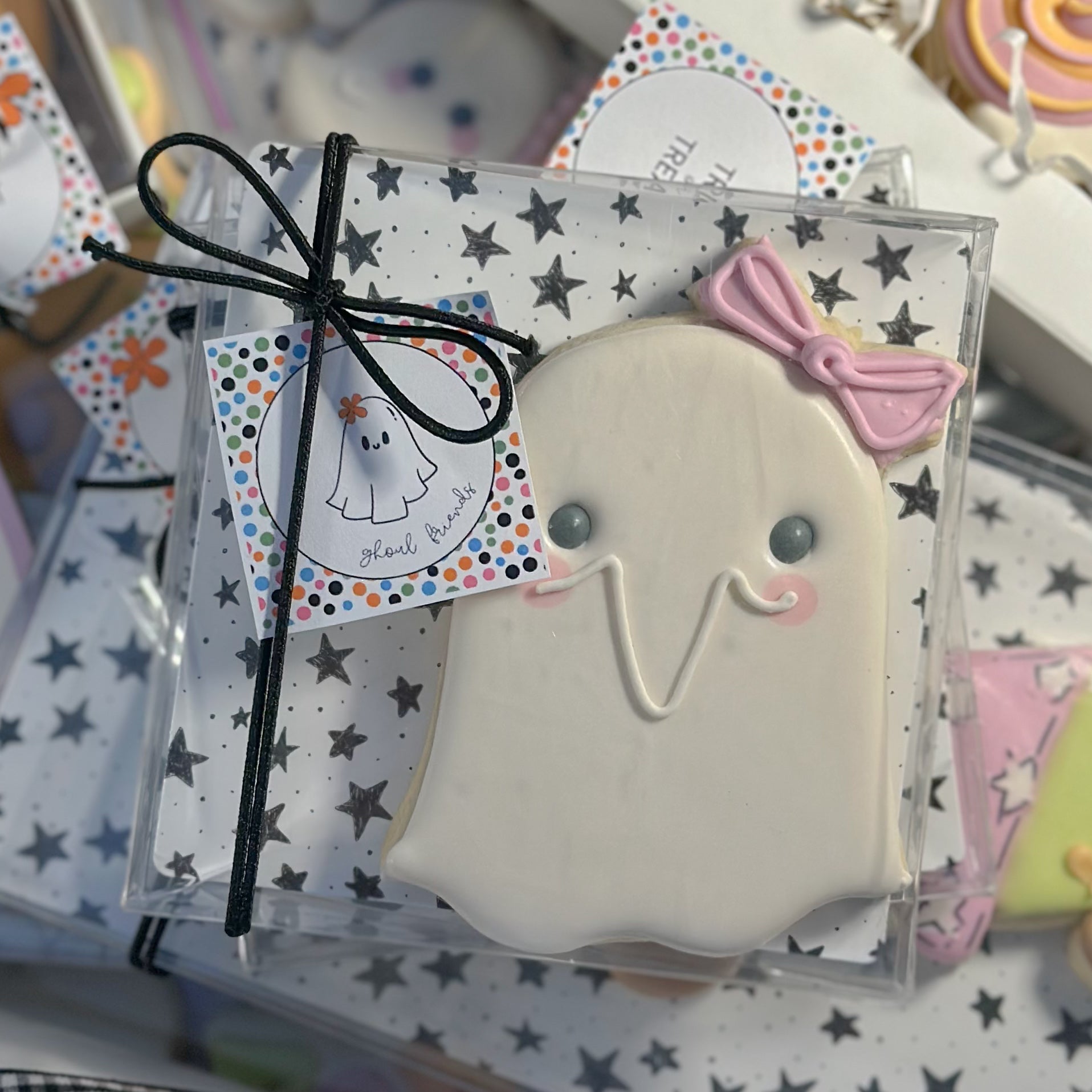 Just the right amount of spooky and sweet, this "ghoul-friend" cookie is perfect for Boo baskets, gifting or a sweet treat for all your "ghoul"friends. Individually heat sealed, packaged in a clear box with coordinating backer, tag and stretch loop. (1) large cookie.