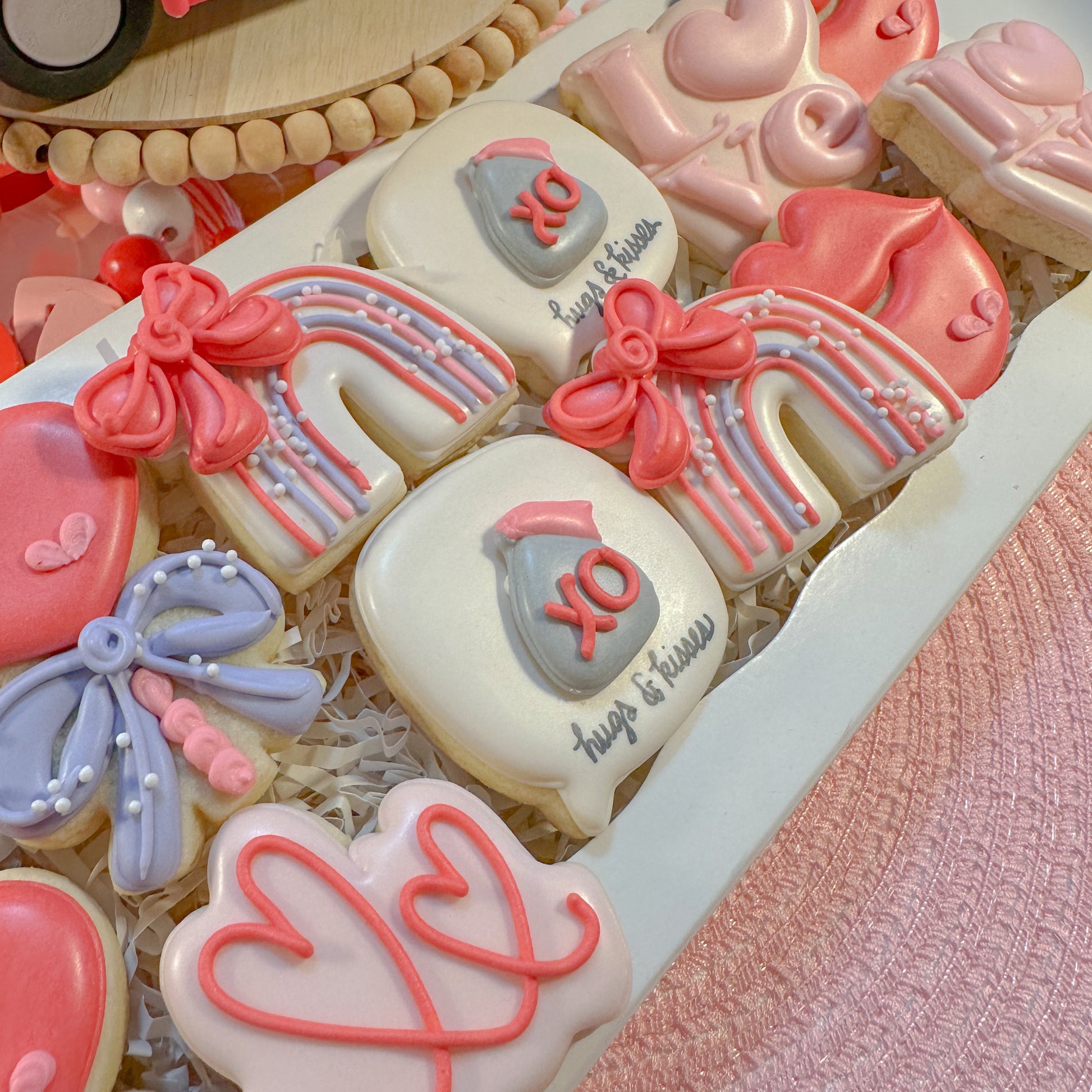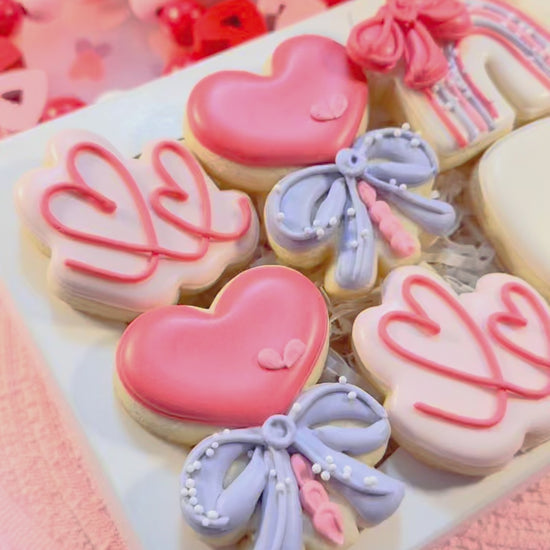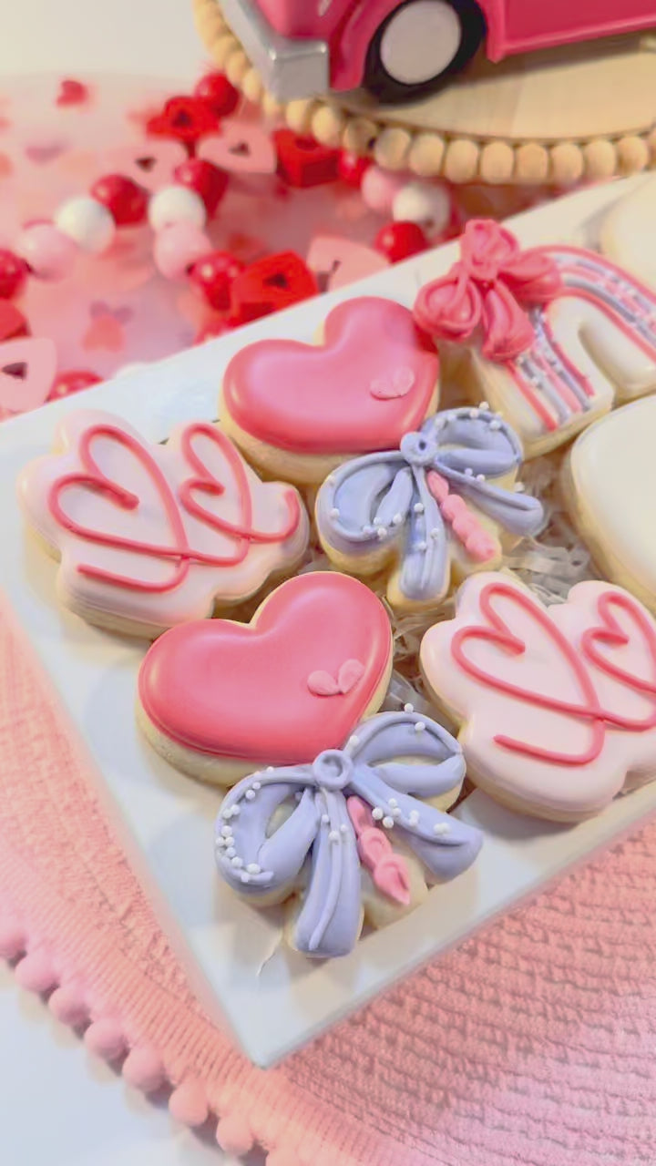 A dozen sweet reasons to celebrate LOVE ! Valentine’s Day mini cookies are perfectly packaged and ready to share, gift and enjoy. Cookies are individually heat sealed for freshness, boxed and finished with a coordinating ribbon and tag. Included in this set: (2) doodle heart, (2) heart lollipop, (2) rainbow, (2) hugs & kisses, (2) LOVE (2) lip cookies.
